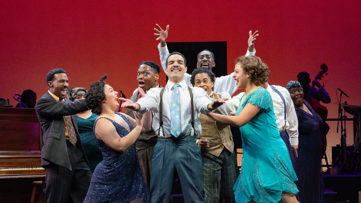 Stanley Martin as Jelly Roll Morton and the ensemble of ‘Jelly’s Last Jam’ at Bristol Riverside Theatre. (Photo by Mark Garvin.)