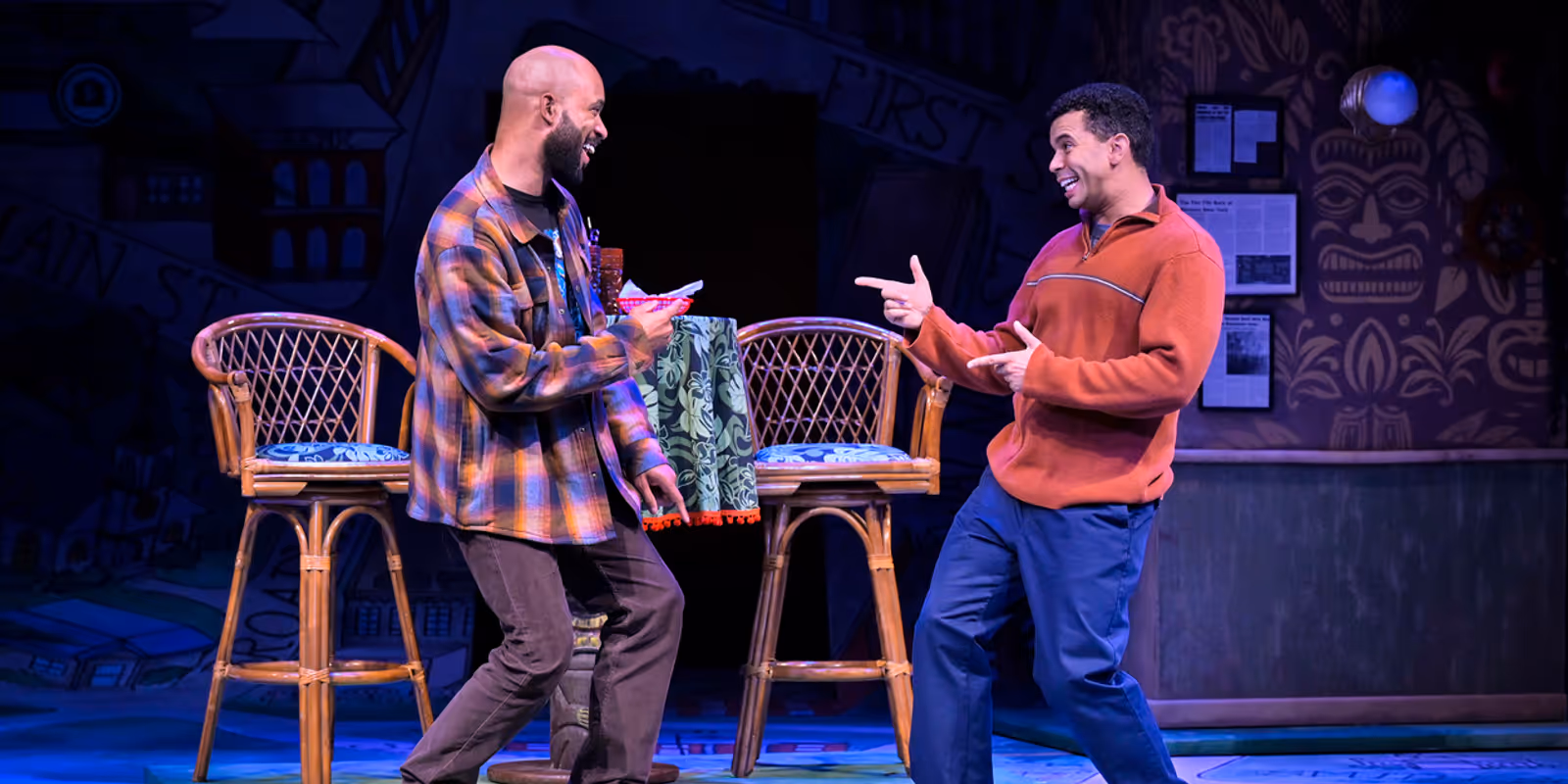 The initial setup is a show unto itself. Playing Kenneth, William Thomas Hodgson has that particular “it” quality of instant likeability. He steps out on a gargantuan Chamber of Commerce map of Cranberry, New York (a suburb of Rochester), to give a TED Talk on his beloved town. Christopher Fitzer’s innovative set lights up with little Google Map-style icons as Kenneth boasts of a grocery store, two banks, a bookstore, and a tiki lounge called Wally’s.